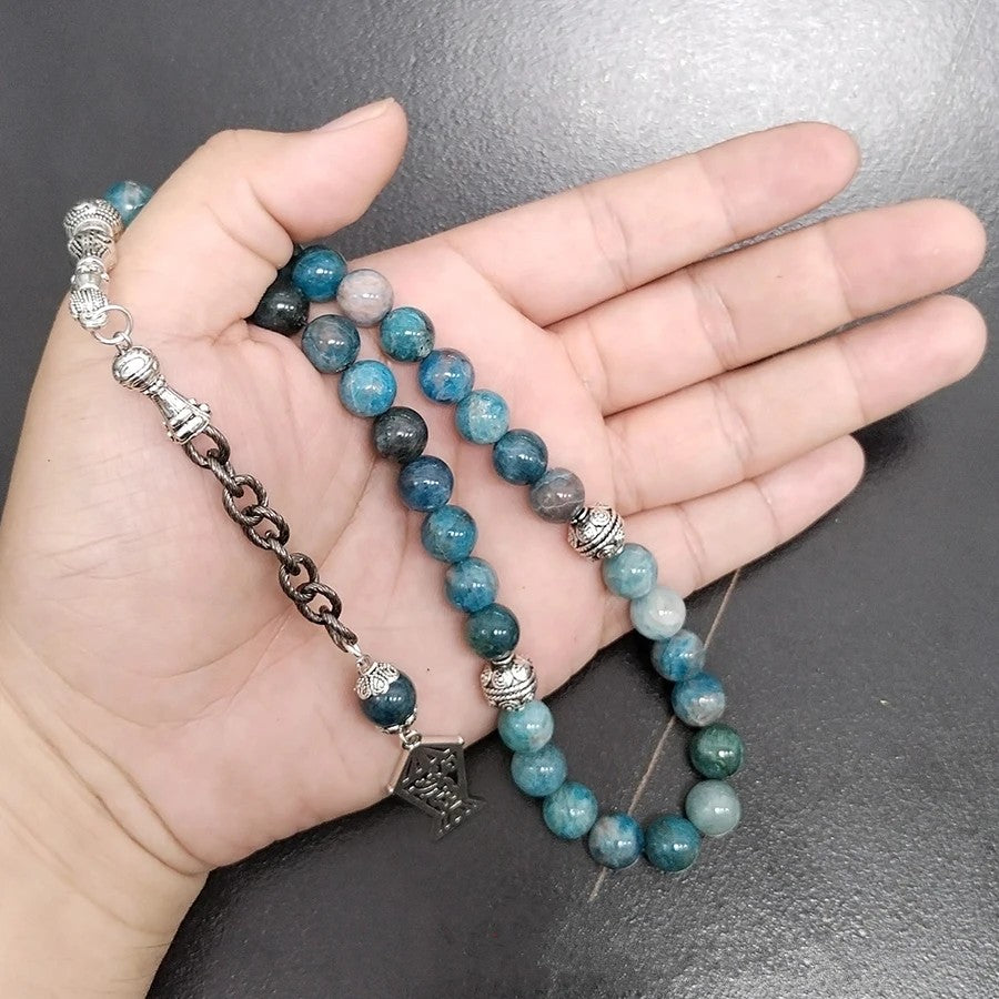 Ce tasbih en pierre d'apatite présente un design magnifique et un artisanat méticuleux. Chaque détail est travaillé avec précision pour offrir un bijou islamique élégant et significatif.